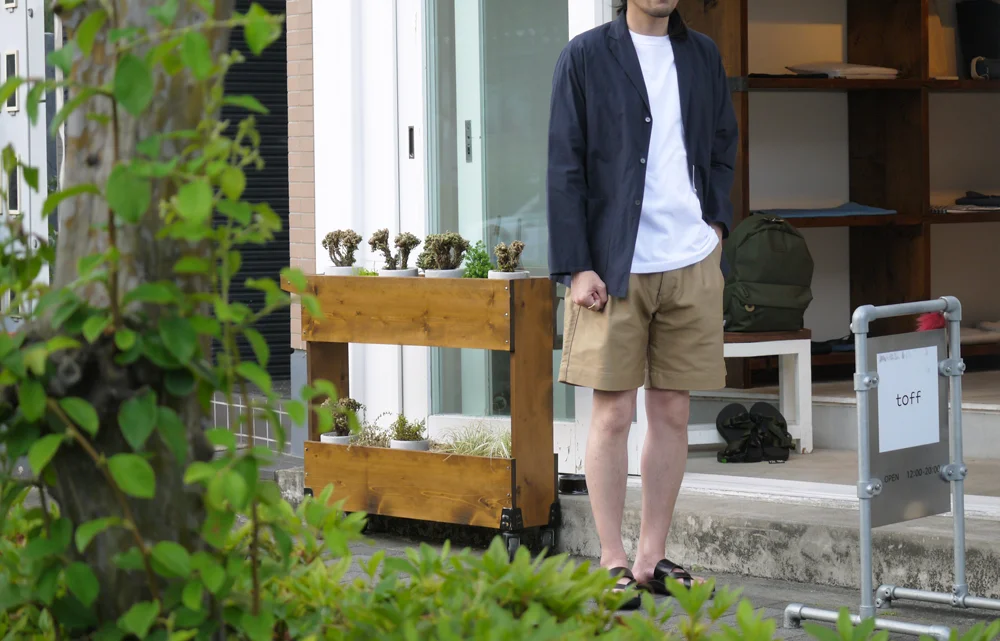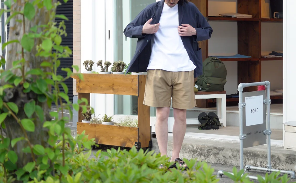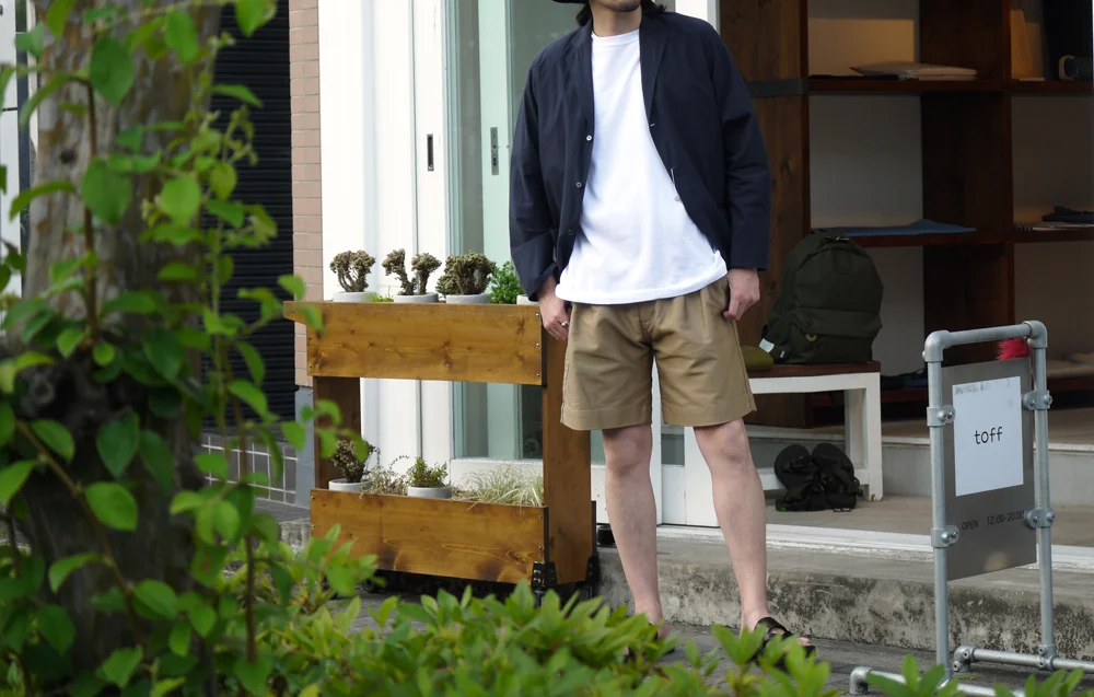 【AURALEE】のショーツに【COMOLI】の極薄半袖スウェットを色違いでスタイリング。