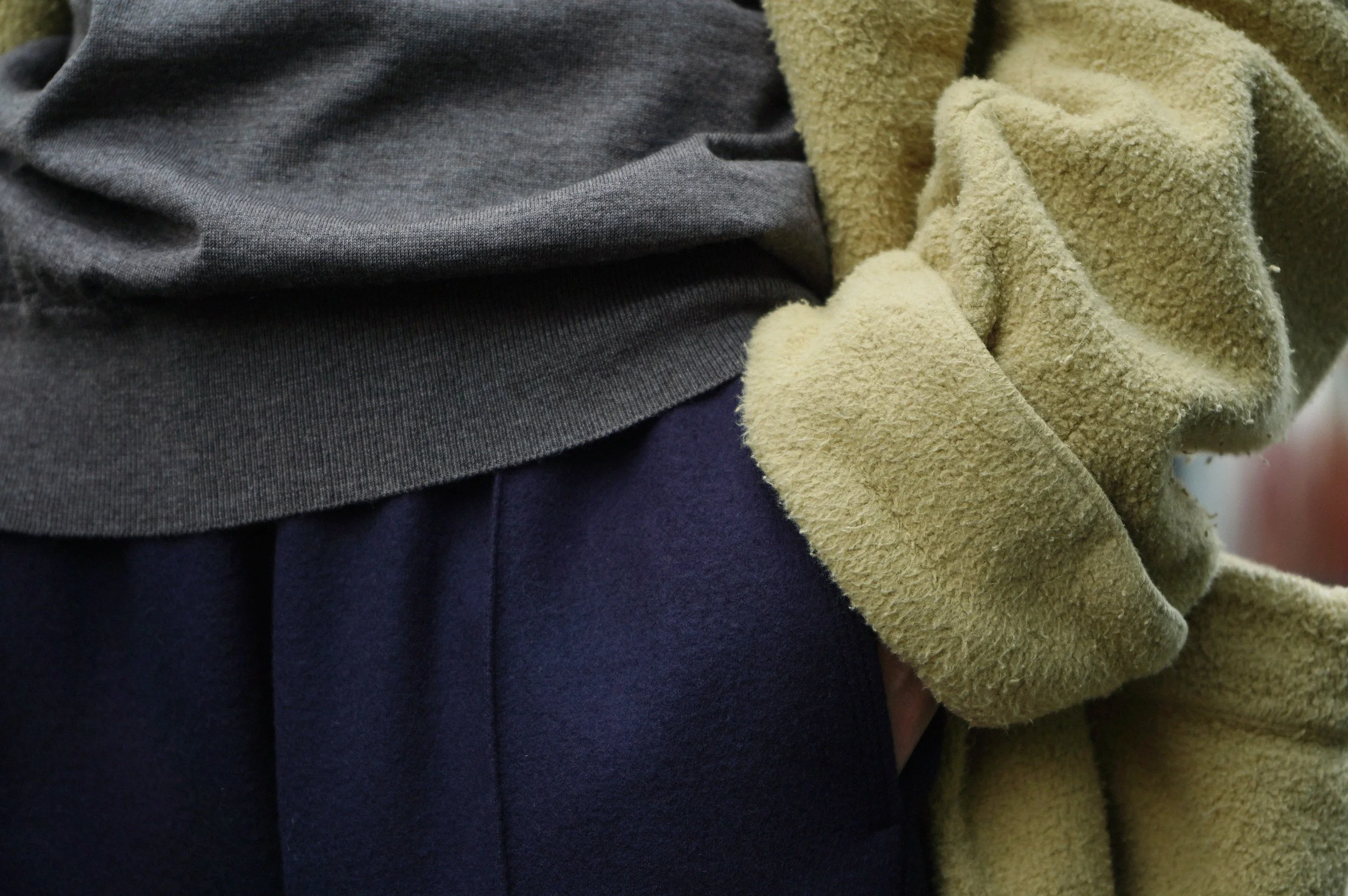 縮絨糸で限界まで度詰に編んだ生地は、独特な肌触りと品の良い光沢があります。