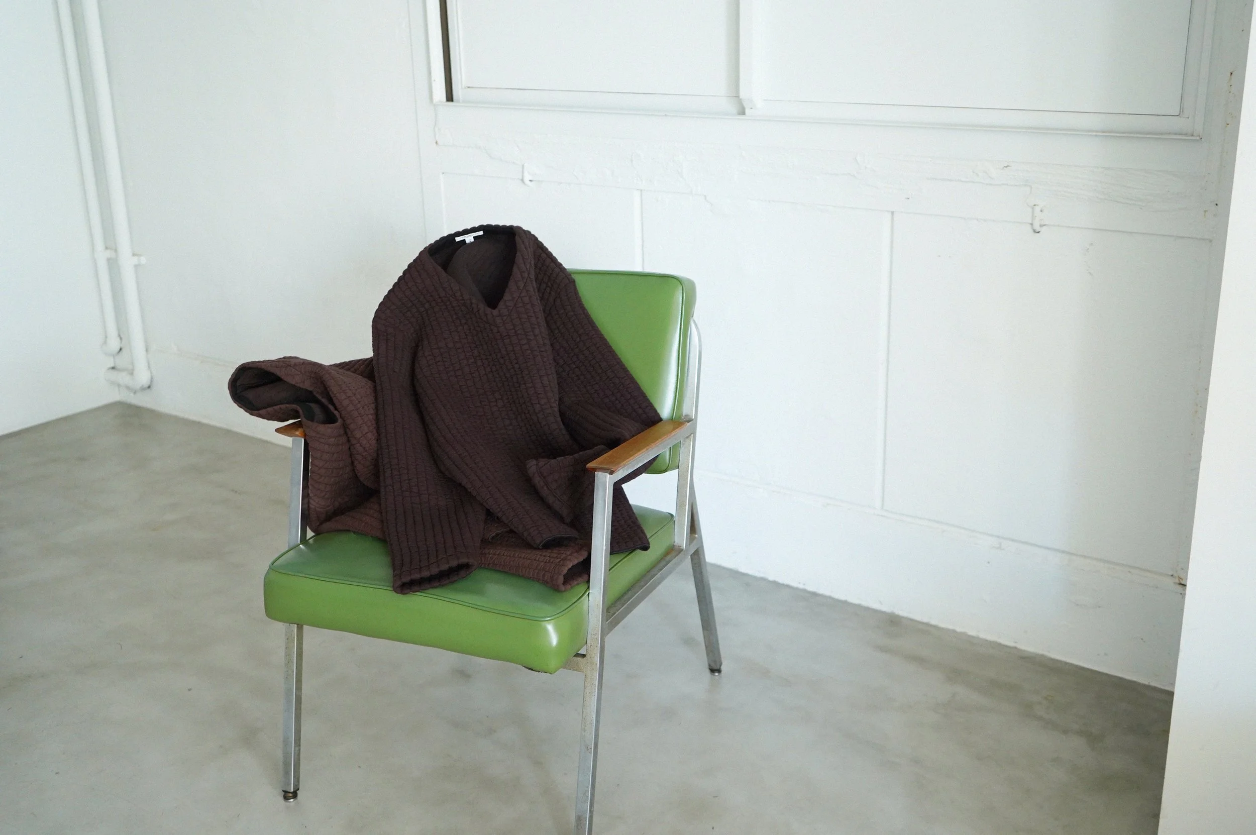 新型のVネックは、厚手の中綿入りキルト生地を使用した、その独特な佇まいが魅力的。