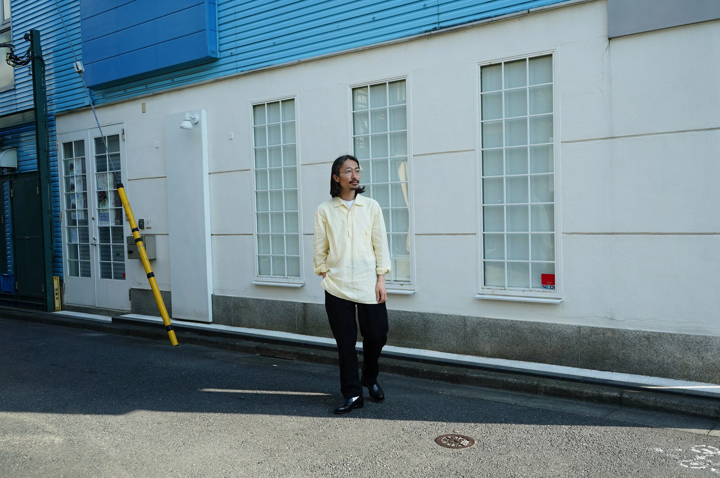 ぜひ真夏に短パン合わせで着てみていただきたいんですが、先ずはいつものデニムやスラックスと。