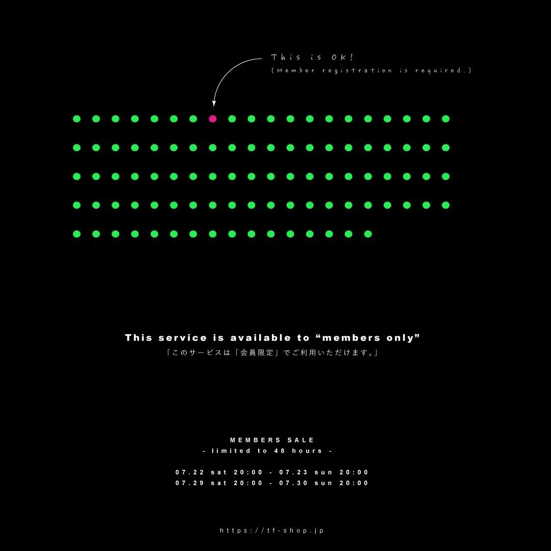 7月中の土曜日20:00-日曜日20:00までの間、会員登録者の方専用の特別なsaleを行います。