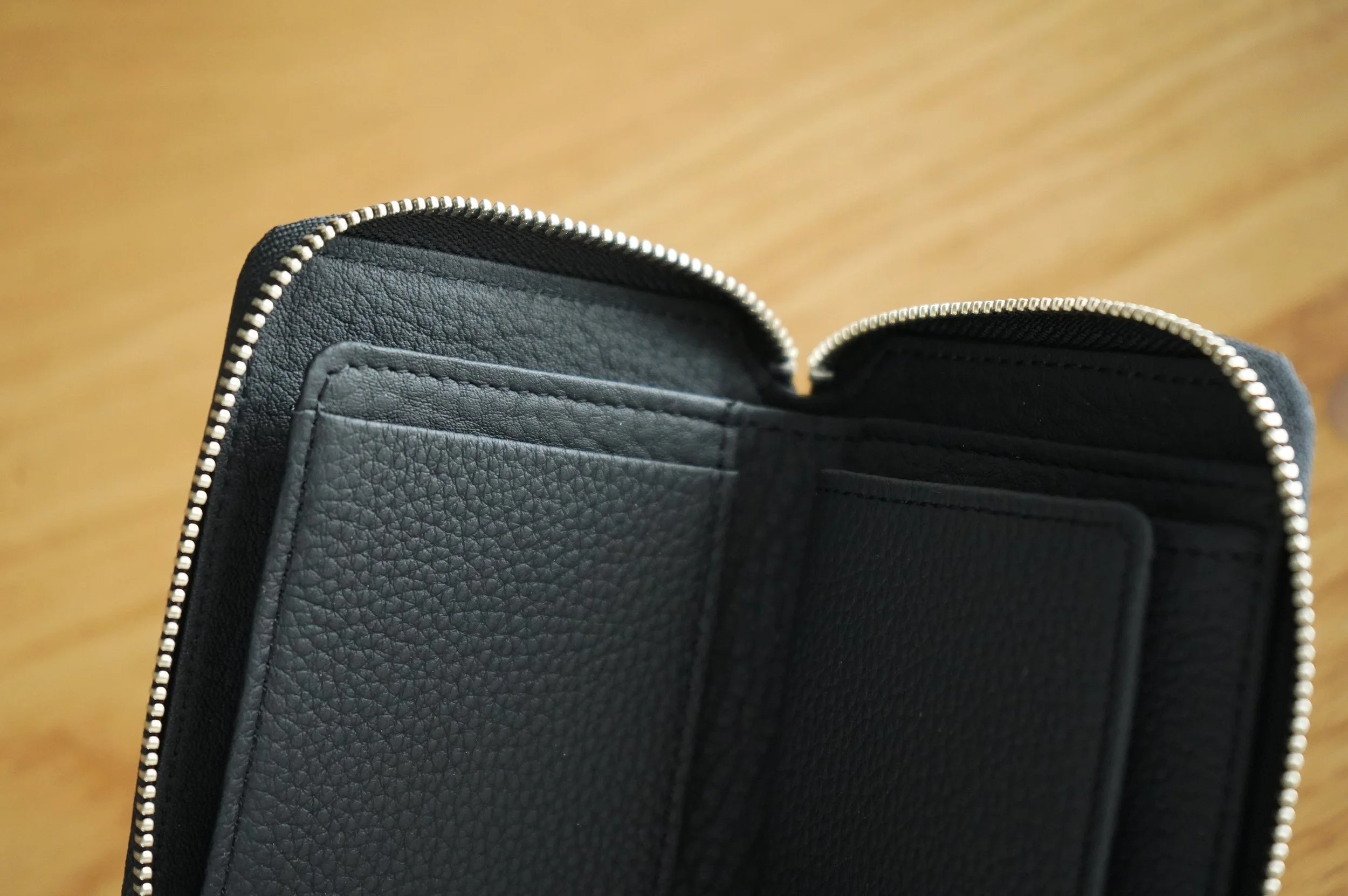 できる限り小さくした手のひらサイズで、1万円札は折らずに入り、ボックス型の小銭入れ、カード室は2室ながらカードサイズのフリーポケットが2室あるので複数枚カードを収納できます。