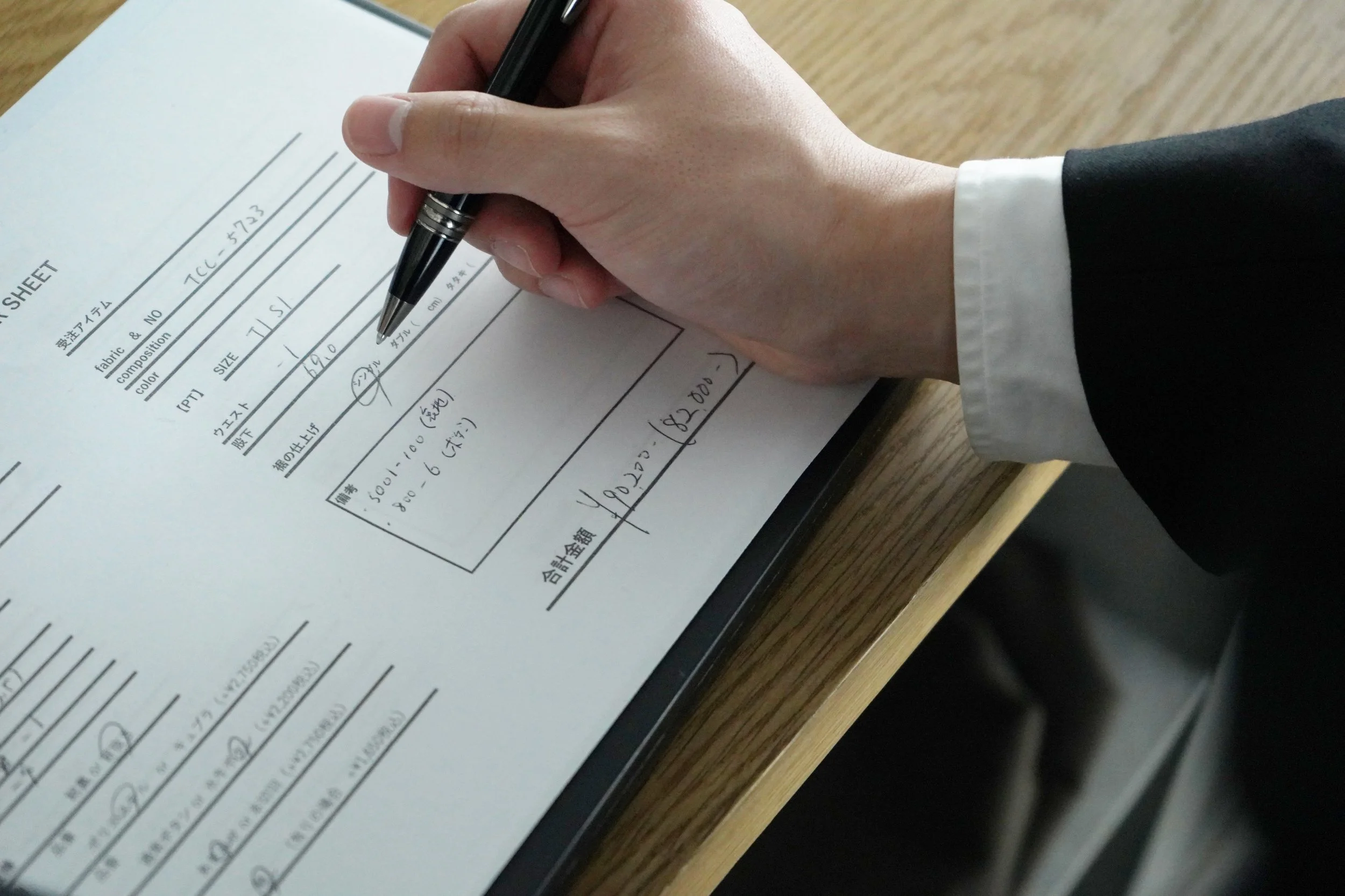 体型に近いサイズサンプルをご着用いただき、一人一人体型に合わせて寸法を調整します。